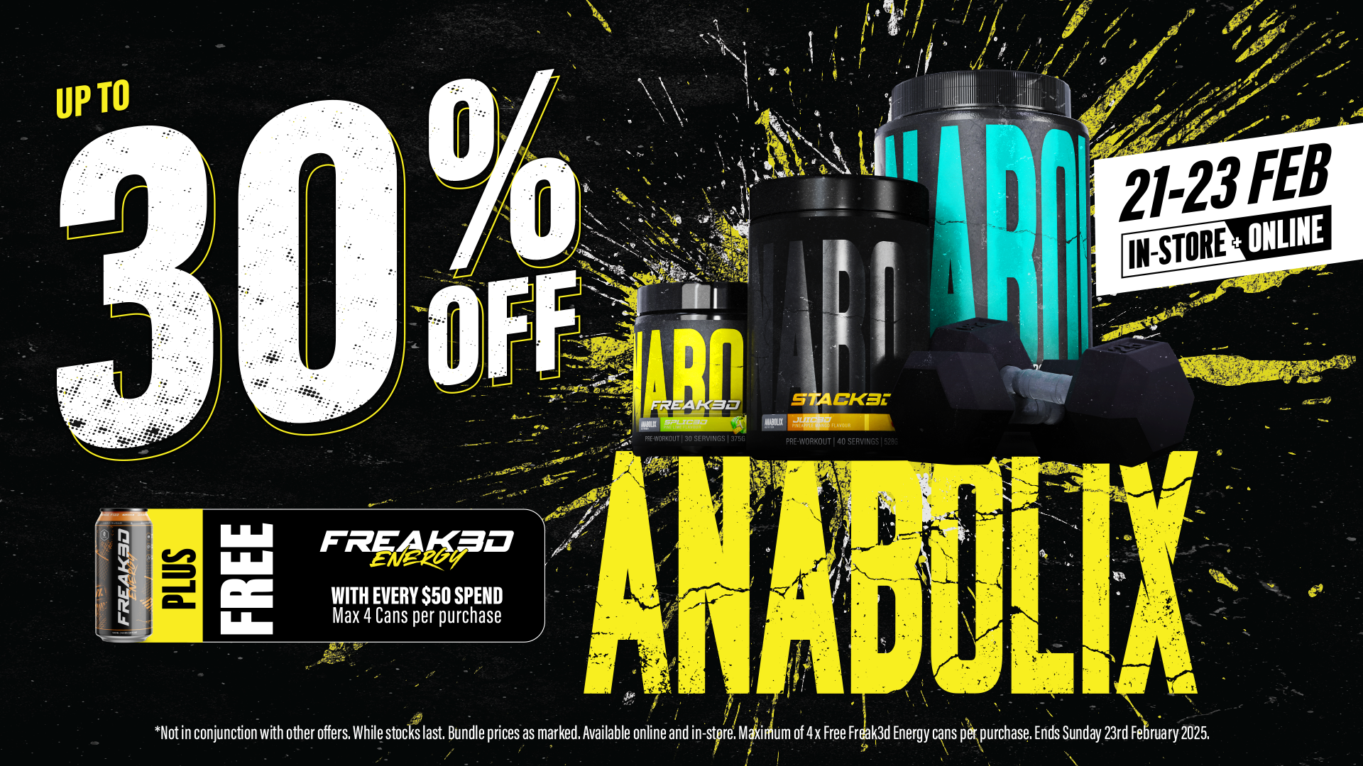 Enjoy 20% off the entire Anabolix Nutrition range and up to 30% off stacks, plus receive a FREE Anabolix Freak3d Energy RTD for every $50 spent on Anabolix items (maximum of 4 free cans per purchase). This exclusive offer is available online and in-store from Friday, 21st February, until Sunday, 23rd February 2025. Bundle prices are as marked and cannot be combined with any other offer. Promotion is valid while stocks last.
