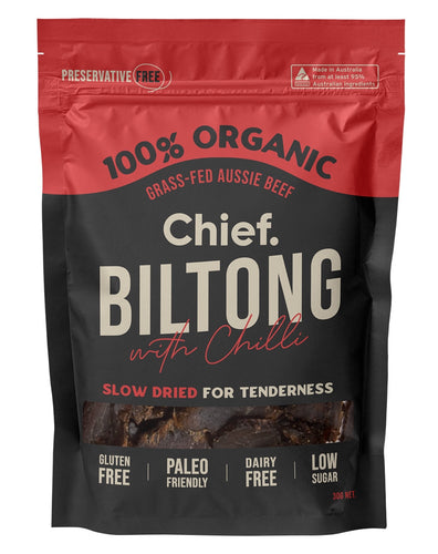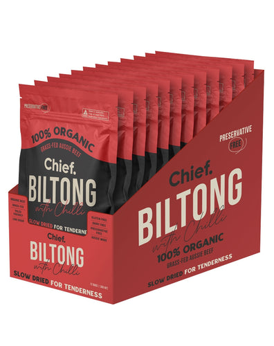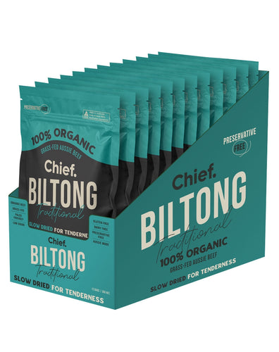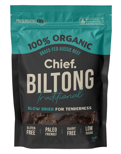 The difference Biltong will deliver you a healthier, juicier and tastier savoury snack. Biltong by Chief is made with 100% organic, grass feed, and grass-finished Aussie farmed beef free from all the nasties you will find in dried and cured meats. Add this delicious 100% organic grass feed Aussie beef snack to your list. Slowed cooked for tenderness, Biltong is high in protein, low in carbs, making it the perfect snack pre or post-workout.