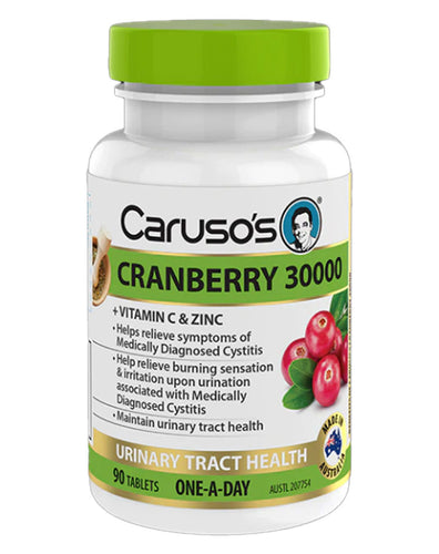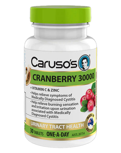 Cranberries also provide antioxidant support, helping reduce free radicals formed in the body. This formula has added vitamin C and zinc to support a healthy immune system function. Reduce the occurrence and symptoms of medically diagnosed cystitis with Caruso’s Cranberry 30000.