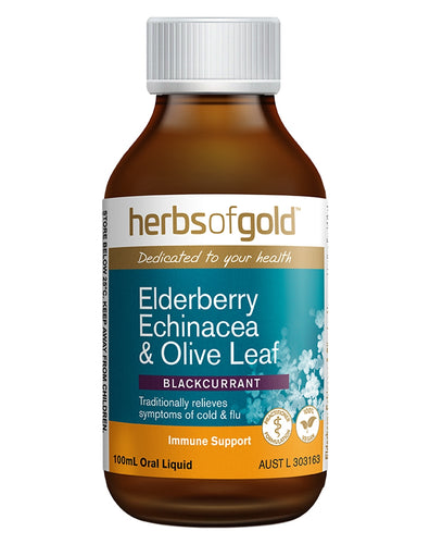 Elderberry Echinacea & Olive Leaf by Herbs of Gold contains herbs that are used in traditional Western herbal medicine. The combination of herbs in this product will help to reduce the symptoms of common colds and flu.