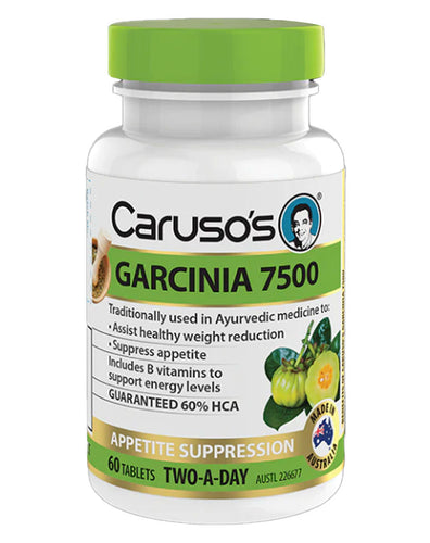 Support healthy appetite and energy levels with Garcinia 7500 by Caruso’s Natural Health. This formula contains garcinia, a herb traditionally used in Ayurvedic medicine to suppress the appetite and enhance feelings of satiety. This herb is also used in Ayurvedic traditional medicine to assist in the reduction of excess weight.