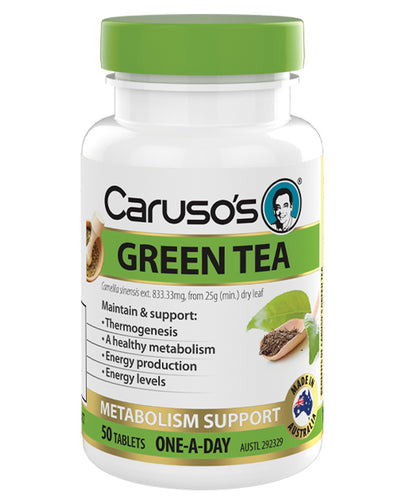 Green Tea by Caruso’s Natural Health has been formulated to provide a high potency dose of green tea, promoting energy levels and supporting calorie burning. This one-day formula contains a high potency dose of Green Tea, which has been standardised to the active constituent and natural antioxidant, Epigallocatechin-3-0-gallate (EGCG).