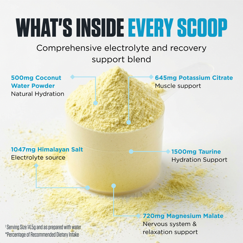 Ingredients - Highly Branched Cyclic Dextrin, Flavours, Taurine, Anticaking Agent (551), Acidity Regulators (330, 296), Himalayan Salt, Sodium Citrate, Magnesium Malate, Potassium Citrate, Coconut Water Powder, Sweetener (955), Senactiv® (Panax notoginseng (Root) & Rosa roxburghii Tratt (Fruit)).
