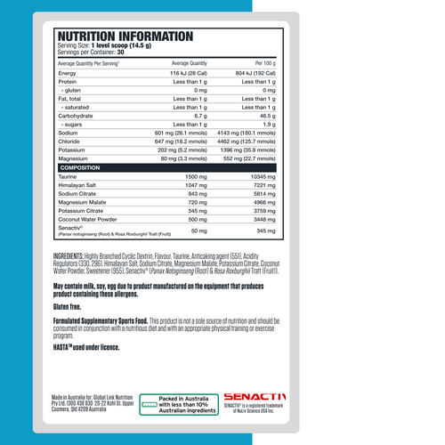 Ingredients - Highly Branched Cyclic Dextrin, Acidity Regulators (296, 330), Taurine, Anticaking Agent (551), Himalayan Salt, Sodium Citrate, Magnesium Malate, Flavour, Potassium Citrate, Coconut Water Powder, Sweetener (955), Senactiv® (Panax notoginseng (Root) & Rosa roxburghii Tratt (Fruit)).
