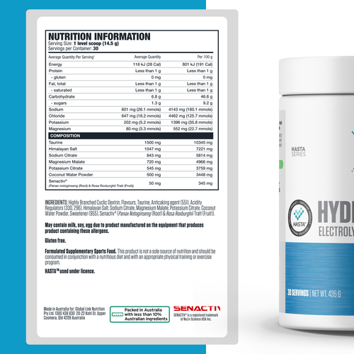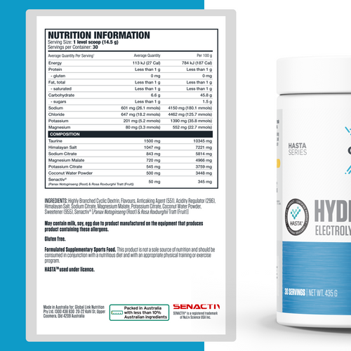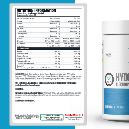 Ingredients - Highly Branched Cyclic Dextrin, Flavours, Anticaking Agent (551), Acidity Regulator (296), Himalayan Salt, Sodium Citrate, Magnesium Malate, Potassium Citrate, Coconut Water Powder, Sweetener (955), Senactiv® (Panax notoginseng (Root) & Rosa roxburghii Tratt (Fruit)).