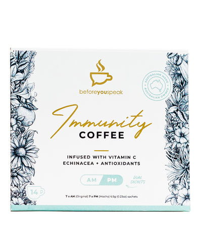 Take your morning ritual one step higher with Immunity Coffee by Before You Speak. The perfect day and night coffee blend support your health and wellbeing. The Immunity Coffee comes in AM and PM sachets.