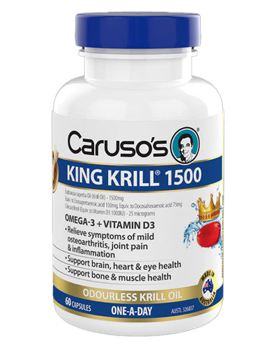 King Krill 1500 by Carusos Natural Health has a combination of high potency, odourless krill oil with vitamins, developed with the intention of helping to relieve the inflammation, pain, and swelling associated with mild osteoarthritis while also supporting the maintenance of healthy bones in adults.