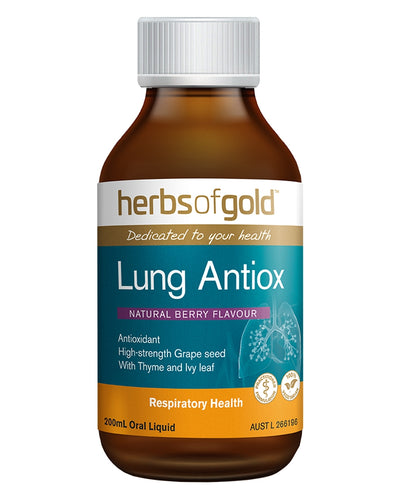 Lung Antiox by Herbs Of Gold has been formulated with antioxidant herbs, thyme, and grape seed that have traditionally been used in Western herbal medicine to support lung health, relieve coughs, and decrease bronchial mucous congestion. Lung Antiox is a vegan-friendly oral liquid that has a great tasting berry flavour and is naturally sweetened with stevia.