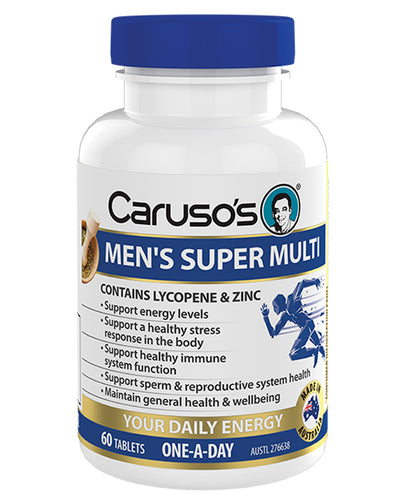 Caruso's Men's Super Multi is a potent multivitamin supplement that has been formulated for men with over 25 vitamins, minerals, antioxidants, and nutrients to support men’s general health and wellbeing, while also maintaining energy production, supporting a healthy stress response in the body, and maintaining reproductive system health.