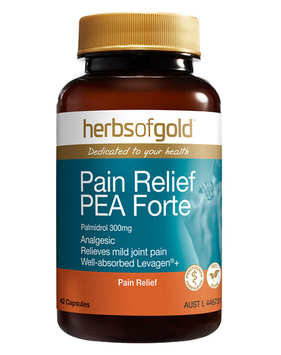 Pain Relief PEA Forte by Herbs of Gold is a natural supplement formulated to help relieve mild pain, reduce inflammation, and support nerve health. Each capsule contains 300mg of palmitoylethanolamide (PEA) as Levagen®+, a clinically studied form of PEA enhanced for superior absorption. This vegan-friendly product supports mild arthritis, joint pain relief, and nerve health while being free from artificial additives, gluten, lactose, and animal products.