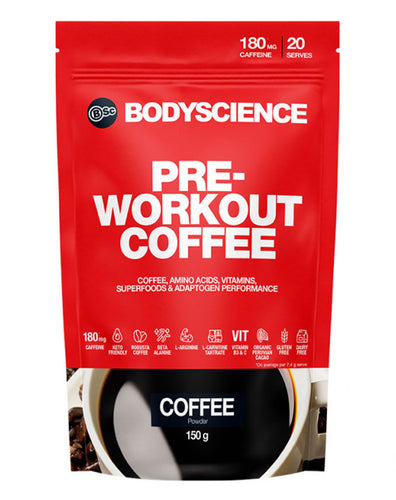 Improve performance, focus and energy when training without the sick candy-flavoured pre workouts! Pre Workout Coffee by Body Science BSc is a premium high-performance functional coffee for those looking for an alternative to pre workouts. With a blend of strong Robusta coffee, amino acids, superfoods and adaptogens, you’ll get that extra bit of energy and pump needed before a workout.