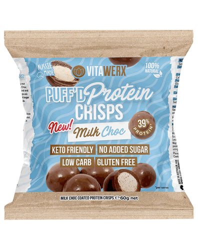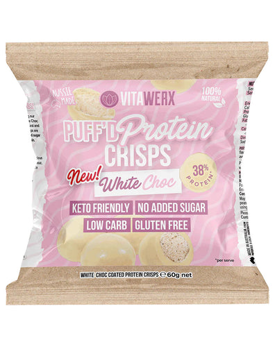 Satisfy your sweet tooth with Vitawerx White Chocolate Puff'd Protein Crisps! They are keto-friendly, gluten-free, and packed with 100% natural ingredients and over 23g of protein per serving. There are no artificial additives or added sugars. Read more