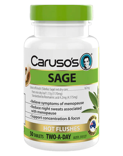 As a menopausal supplement it can have a variety of potential benefits. Traditionally, in Western herbal medicine, it was used for reducing the perspiration peri-menopausal women can experience. Sage by Caruso's Natural Health could also reduce other symptoms of menopause, including relieving the hot flushes.