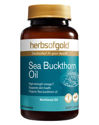 Support skin health with Herbs of Gold Sea Buckthorn Oil. A premium, high-strength supplement featuring organic Sea buckthorn oil, renowned for being a rich source of fatty acids, including the rare omega-7. The oil is derived from Omegia™, a high-grade, sustainably sourced Sea buckthorn oil that provides a balanced profile of omega-3, 6, 7, and 9 fatty acids.