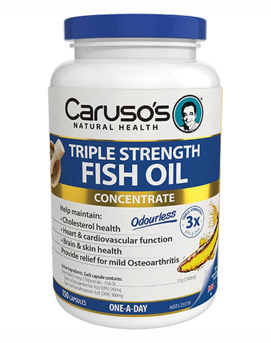 Caruso's Triple Strength Fish Oil is a concentrated Omega-3 supplement with 1500mg of fish oil per capsule. Supports heart, brain, joint, and skin health. Read more