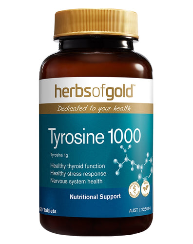 Tyrosine is a non-essential amino acid which is involved in a number of biochemical reactions in the body. It works to assist thyroid hormone production which is responsible for releasing the hormones that control the metabolism and our body’s use of energy from the food we eat. Tyrosine 1000 by Herbs of Gold also supports a healthy stress response in your body by supporting your nervous system health and function plus it aids in the synthesis of neurotransmitters which are important in boosting and balancing signals in the brain.