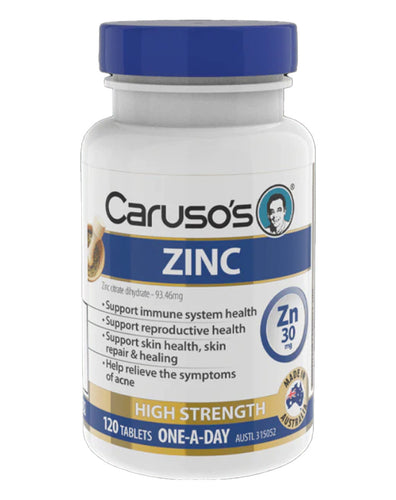 Caruso's Natural Health Zinc supports the immune and reproductive system and skin health. This high-strength, one-a-day formula contains 30mg of zinc, which helps to enhance general health and wellbeing.