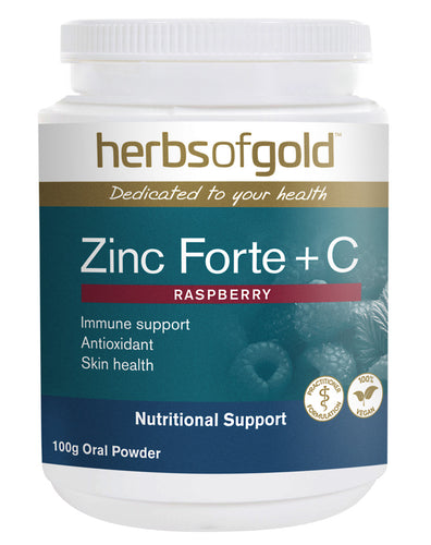 This delicious, natural raspberry flavoured powder harnesses the benefits of Zinc which is an essential trace element. Zinc plays an important role in growth, development and supports healthy immune system function. Zinc is also a potent antioxidant that works to reduce free radical damage in the body plus it helps support taste sensation.  The addition of Vitamin C makes this potent formula ideal for supporting connective tissue production and collagen formation which plays an important role in making sure our tissues and organs function properly. Zinc Forte + C By Herbs of Gold also helps maintain skin and bone health, as well as support wound healing.